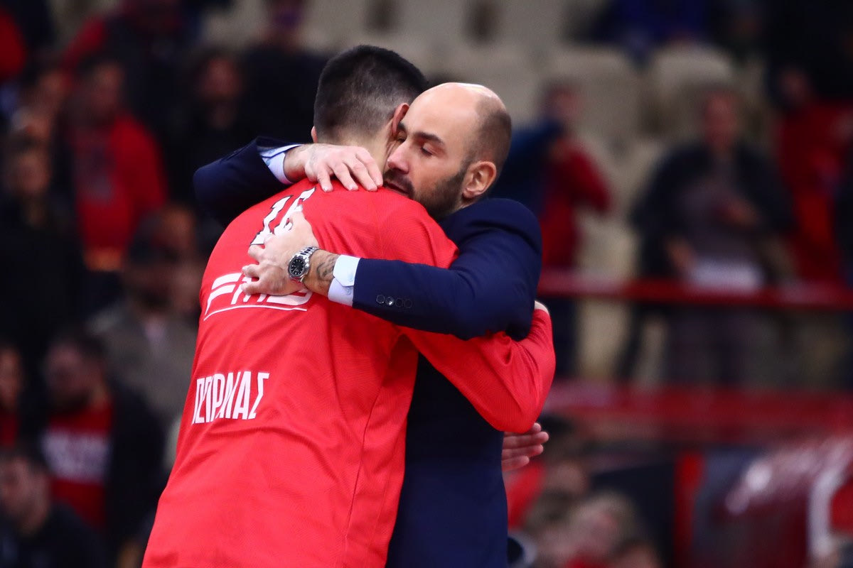 Μια μεγάλη, σφιχτή αγκαλιά έκαναν μετά από το Ολυμπιακός - Περιστέρι ο Κώστας Παπανικολάου με τον Βασίλη Σπανούλη.
