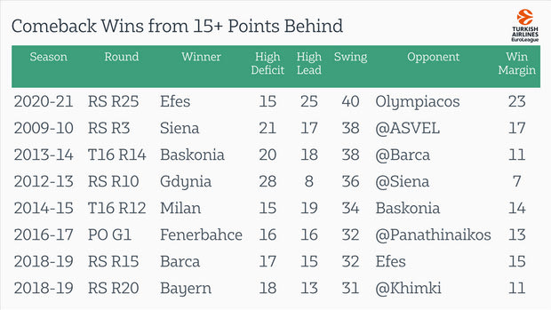 Τη δεύτερη καλύτερη επίδοση έχει η Σιένα που σε αγώνα του 20-09 με αντίπαλο τη Βιλερμπάν βρέθηκε στο -21 και έφτασε στο +17 με ανατροπή 38 πόντων, ενώ στη λίστα με τις οκτώ μεγαλύτερες ανατροπές από το -15 δεν υπάρχει ελληνική ομάδα.