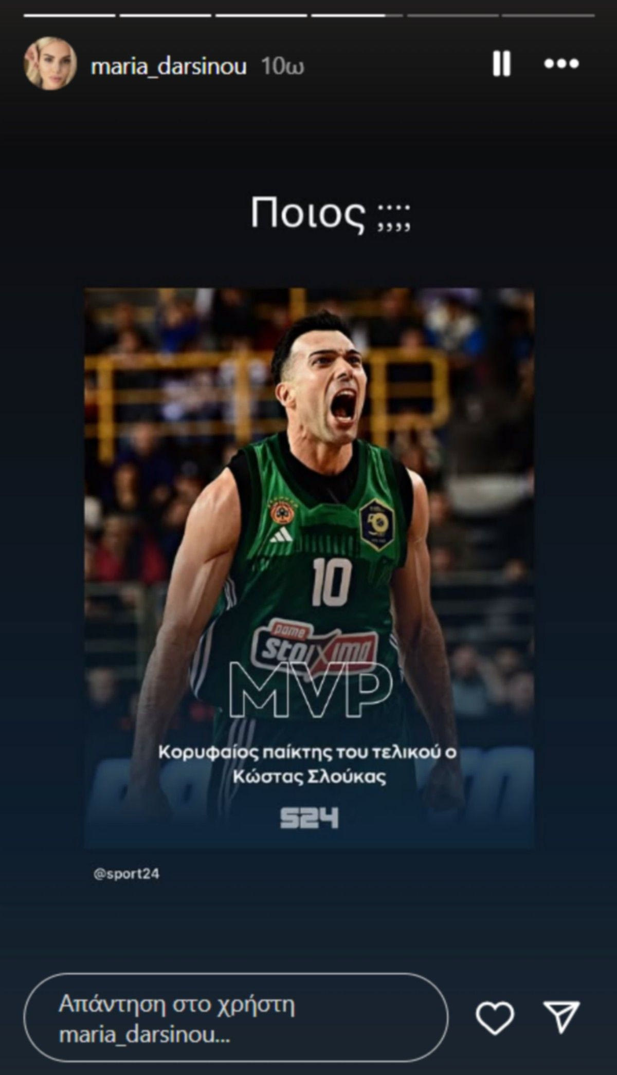 Στο Instagram story της, δημοσίευσε την εικόνα του Σλούκα από το SPORT24 με τη φανέλα του Παναθηναϊκού και τον τίτλο του MVP του τελικού, συνοδεύοντας τη με τη λιτή αλλά γεμάτη νόημα ερώτηση: “Ποιος ;;;;”
