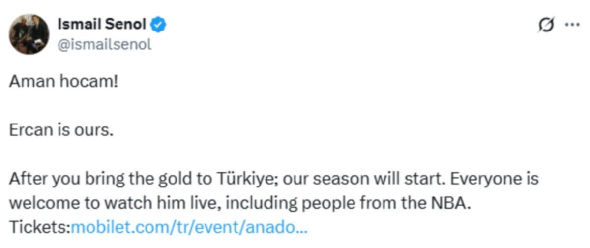 “Ο Ερτζάν είναι δικός μας. Αφού φέρεις το χρυσό στην Τουρκία, η σεζόν μας θα ξεκινήσει. Όλοι είναι ευπρόσδεκτοι να τον δουν ζωντανά, συμπεριλαμβανομένων των ανθρώπων από το NBA. Εδώ είναι τα εισιτήρια”.