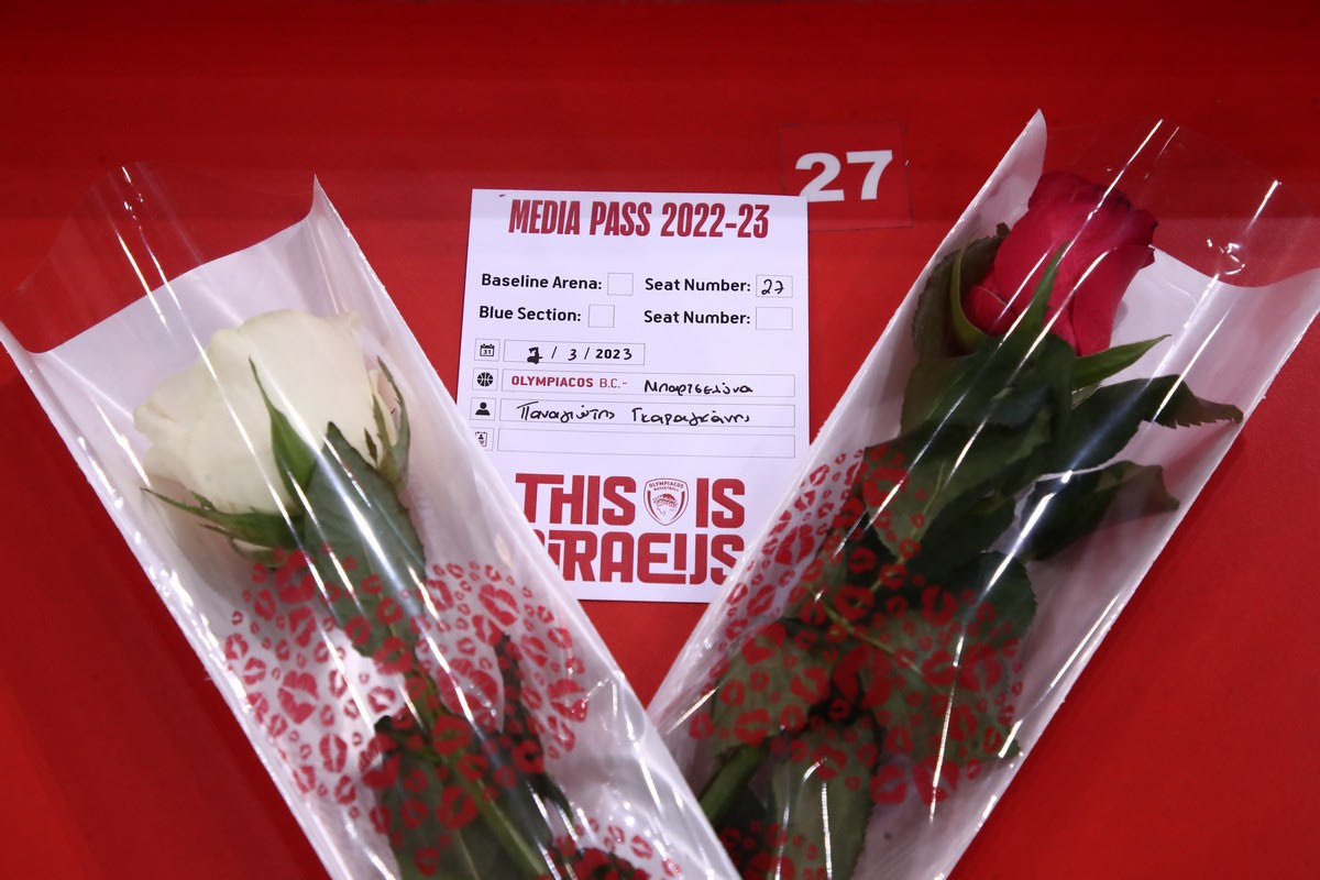 Σε αυτή βρίσκεται η διαπίστευσή του, μαζί με ένα λευκό και ένα κόκκινο τριαντάφυλλο, στα χρώματα της αγαπημένης του ομάδας που αντιμετωπίζει απόψε τη Μπαρτσελόνα για την 27η αγωνιστική της EuroLeague.