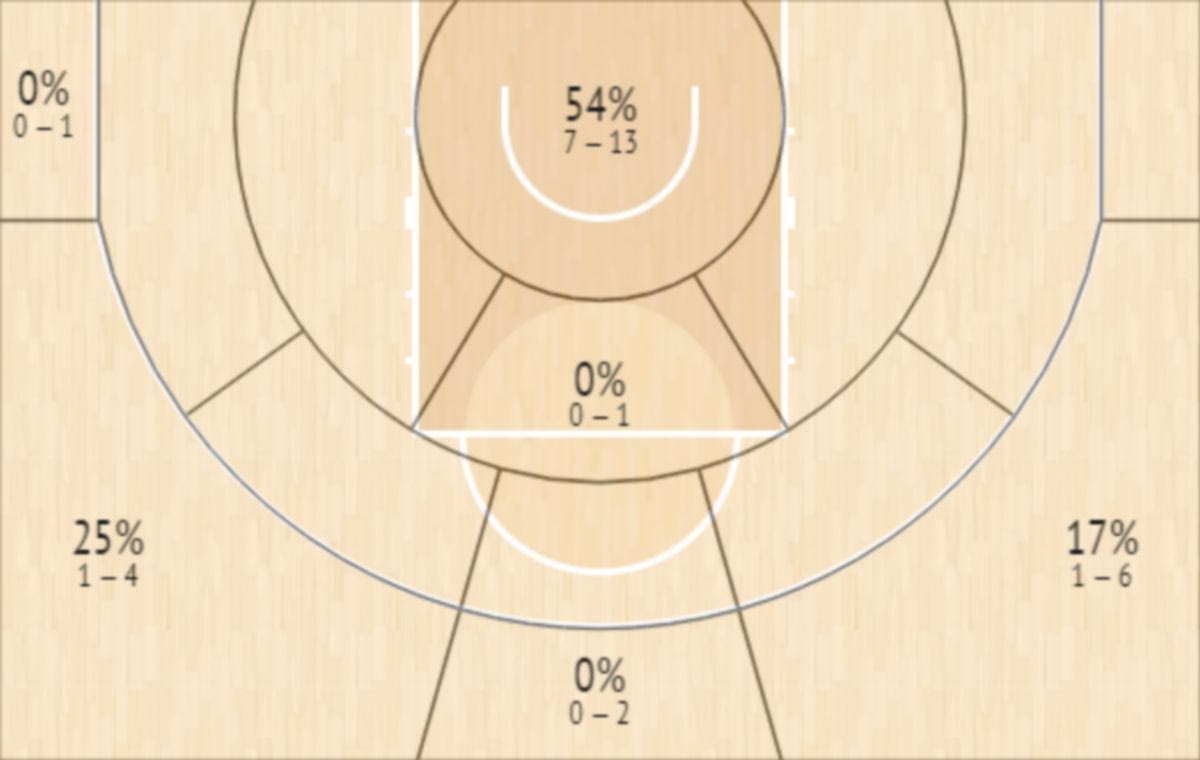 Σύμφωνα με το InStat Scout, η Βιλερμπάν δέχεται μόλις 0.75 πόντους ανά κατοχή όταν ο Αντετοκούνμπο καλείται έπειτα από αλλαγές στο Πικ εν Ρολ να μαρκάρει τον αντίπαλο χειριστή της μπάλας, σε ένα εξαιρετικό νούμερο (σε Γαλλία και EuroLeague). Το κυριότερο όμως είναι ότι στα σουτ που έχει κληθεί να μαρκάρει ο 24χρονος σέντερ το ποσοστό των αντιπάλων είναι μόλις 33%. Ιδού και το σχετικό Shot Chart των σουτ που έχει κληθεί να μαρκάρει ο Αντετοκούνμπο.