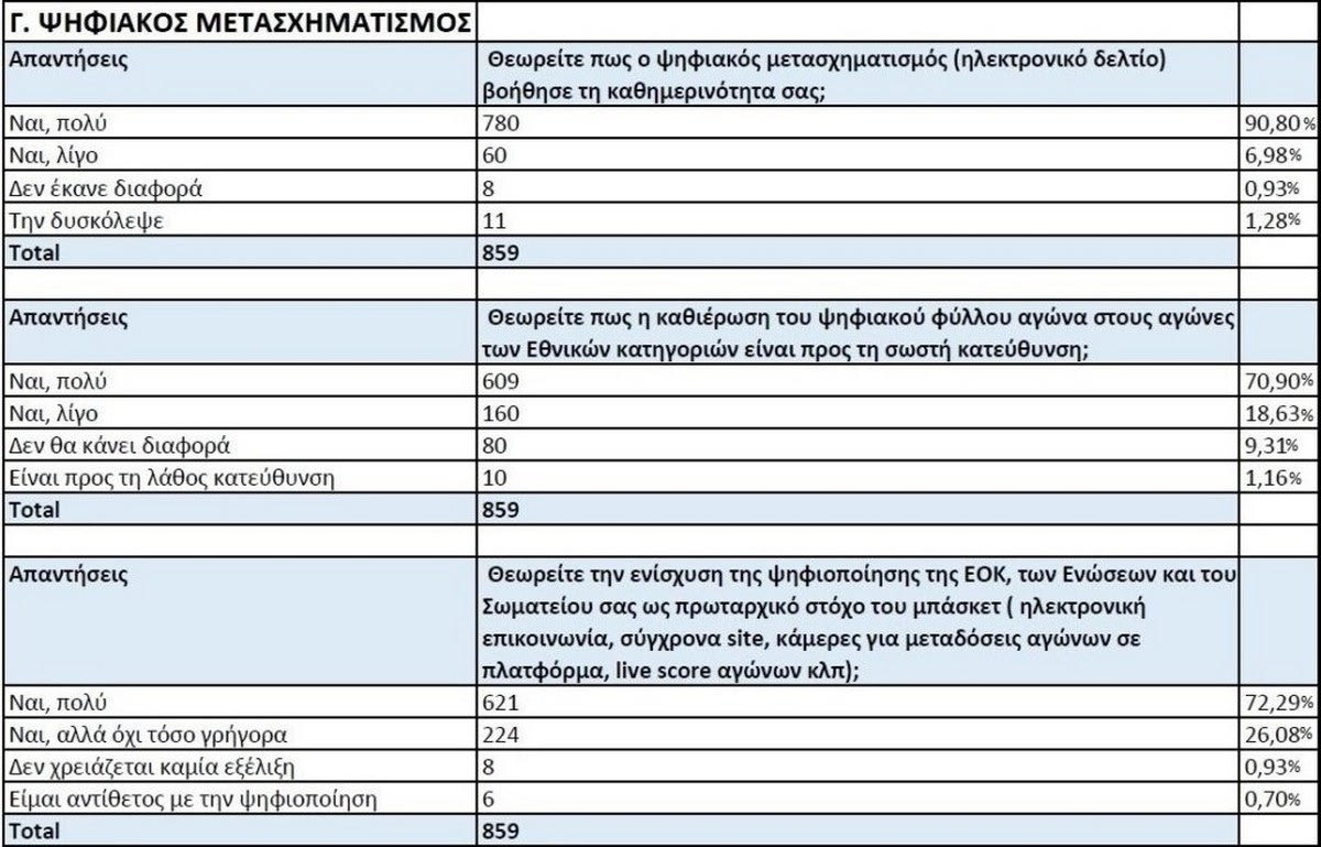 - Ακριβώς ίδιο ποσοστό, 98% δηλαδή, απάντησε θετικά στο ερώτημα, «θεωρείτε πως ένας από τους πρωταρχικούς στόχους του μπάσκετ είναι η ενίσχυση της ψηφιοποίησης με ηλεκτρονική επικοινωνία, σύγχρονα site, κάμερες για δωρεάν live μεταδόσεις αγώνων, εφαρμογές live score αγώνων κλπ;».