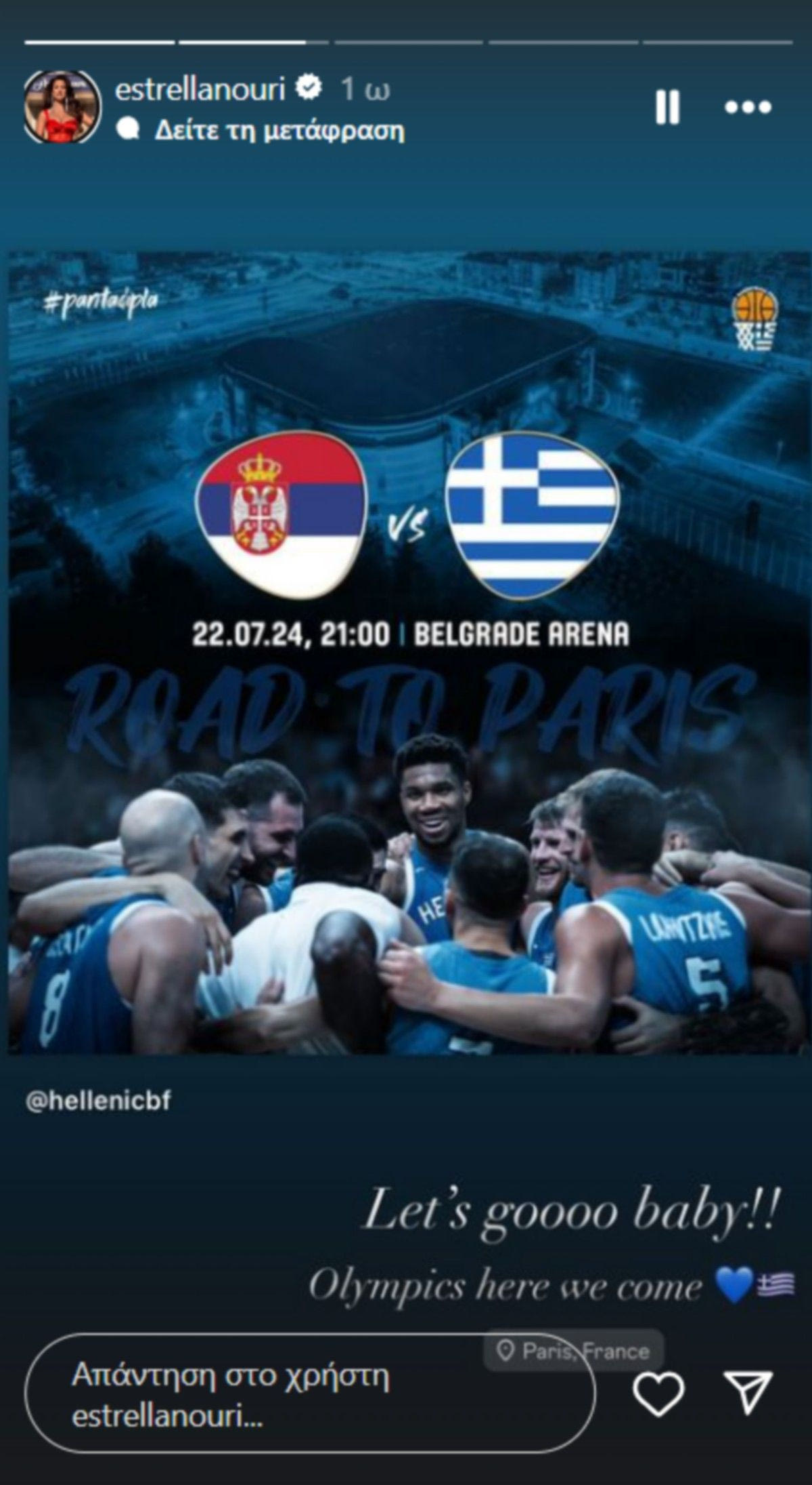 Η σύντροφος του Τόμας Γουόκαπ, Εστρέλα Νούρι, ανήρτησε το ποστ της φιλικής αναμέτρησης, με την φράση “Πάμε μωρό μου. Ολυμπιακοί Αγώνες ερχόμαστε”, δηλώνοντας την ανυπομονησία της.