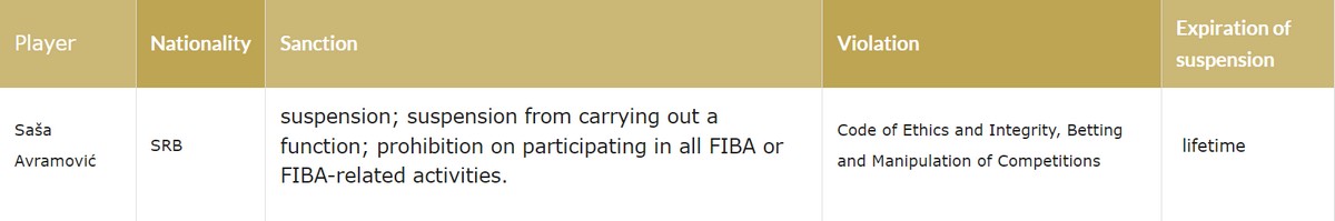Εκτός μπάσκετ, για πάντα, έθεσε τον Σάσα Αβράμοβιτς η FIBA. Η παγκόσμια ομοσπονδία καλαθοσφαίρισης τιμώρησε τον 30χρονο γκαρντ της Ίσκρα Σβιτ σύμφωνα με τον “κώδικα δεοντολογίας και ακεραιότητας, για στοιχηματισμό σε αγώνες“, όπως αναφέρεται στην ιστοσελίδα του BAT, του Διαιτητικού Δικαστηρίου.