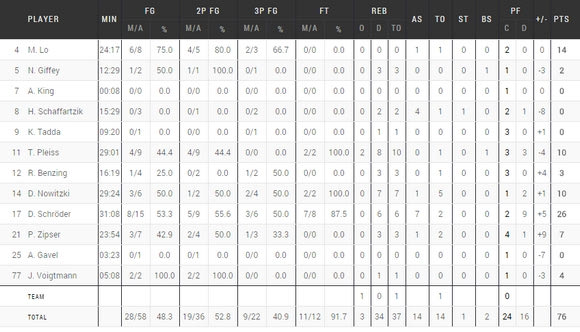 ΓΕΡΜΑΝΙΑ (Φλέμινγκ): Λο 16 (2), Γκιφάι 2, Κινγκ, Σαφάρτζικ, Τάντα, Πλάις 10 (10 ριμπ.), Μπένζινγκ 3 (1), Νοβίτσκι 10 (2), Σρέντερ 26 (3), Ζίπσερ 7 (1), Γκαβέλ, Βόιτμαν 4.