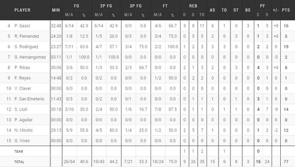 Ο Πάου Γκασόλ έκανε τα πάντα… σωστά για την Ισπανία, έχοντας πληθωρική παρουσία στο παρκέ. Τελείωσε το παιχνίδι με 16 πόντους (6/14 δίποντα και 4/6 βολές), 11 ριμπάουντ, 6 ασίστ και 3 τάπες, κυριαρχώντας κοντά στο καλάθι.