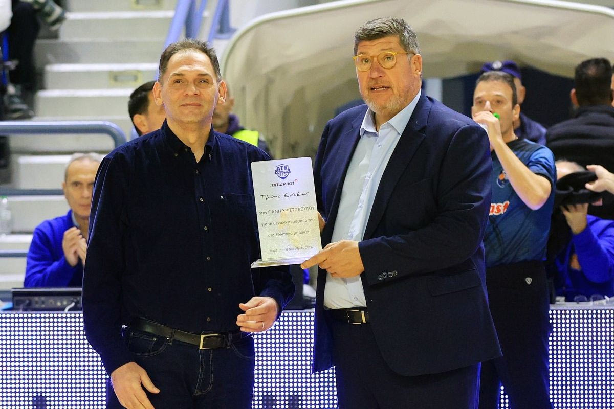 Λίγο πριν το τζάμπολ του αγώνα μεταξύ Καρδίτσας και Πανιωνίου, η θεσσαλική ομάδα βράβευσε τον Φάνη Χριστοδούλου για την προσφορά του στο μπάσκετ.