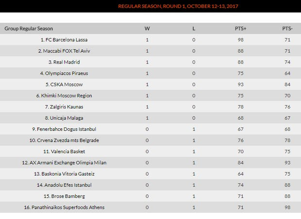 Η κατάταξη και τα αποτελέσματα της EuroLeague (1η αγωνιστική)