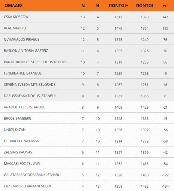 Η κατάταξη της EuroLeague (17η αγωνιστική)