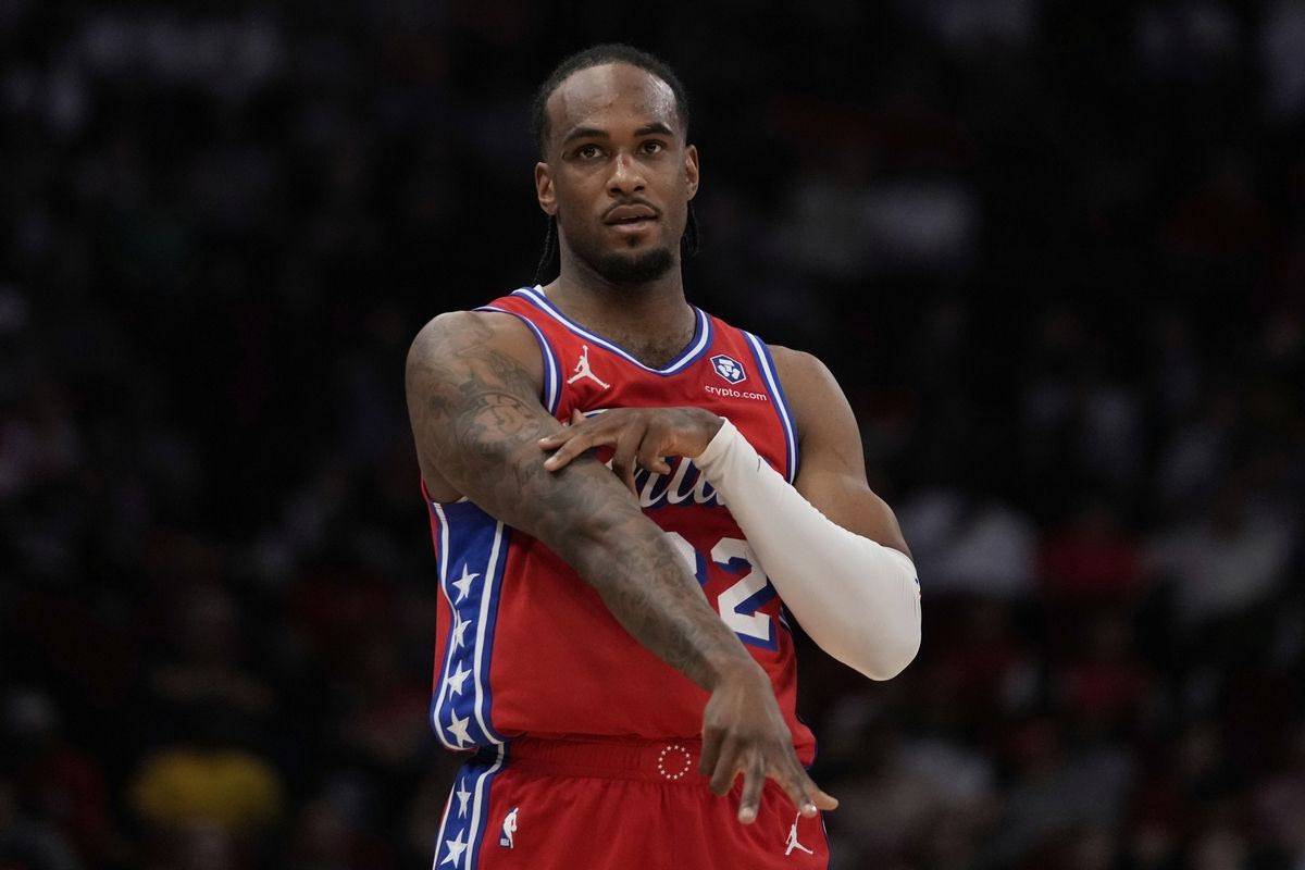 Philadelphia 76ers forward Oshae Brissett celebrates after making a 3-pointer during the first half of an NBA basketball game against the Houston Rockets in Houston, Monday, March 17, 2025. (AP Photo/Ashley Landis)