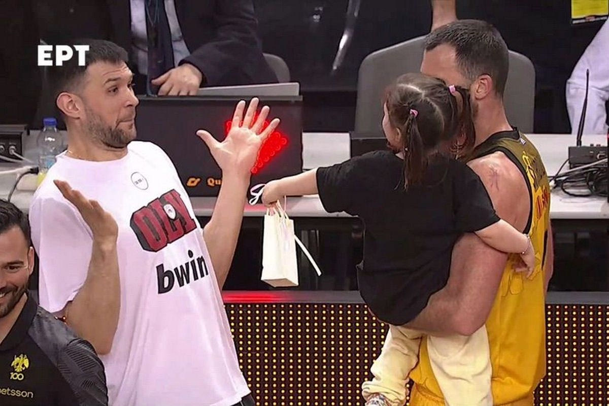 Στιγμές μετά το σφύριγμα της λήξης του Game 2 των ημιτελικών της Stoiximan GBL ανάμεσα στην ΑΕΚ Betsson και τον Ολυμπιακό, γίναμε θεατές της πιο γλυκιάς στιγμής.