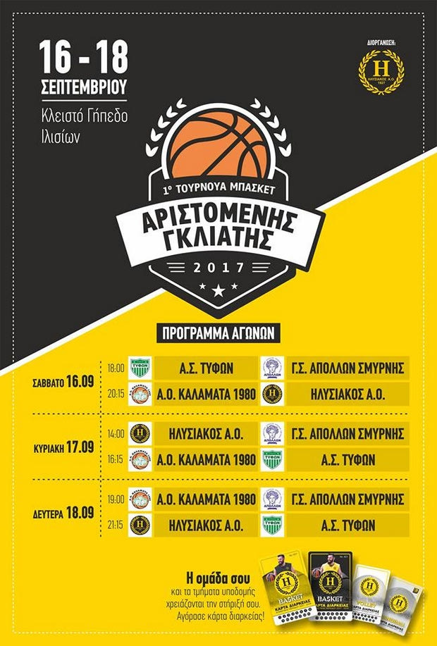 Ο Ηλυσιακός διοργανώνει από τις 16 έως τις 18 Σεπτεμβρίου το 1ο Τουρνουά "Αριστομένης Γκλιάτης" στη μνήμη του αδικοχαμένου μέλους του συλλόγου. Το "παρών" θα δώσουν ο Τυφώνας, ο Απόλλων Σμύρνης και η Καλαμάτα.