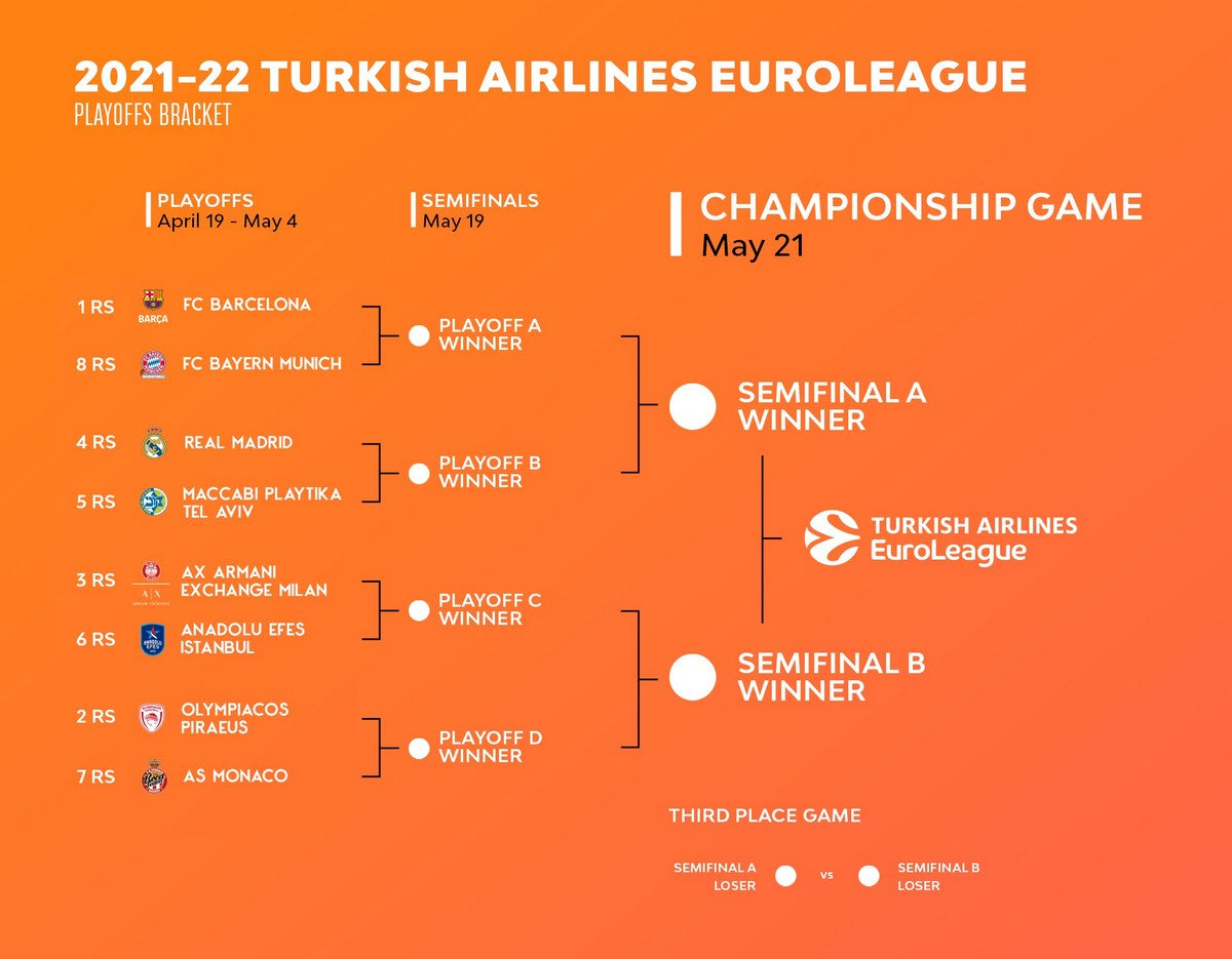 Ολοκληρώθηκε η regular season, μάθαμε και τα τέσσερα ζευγάρια των playoffs της EuroLeague. Δείτε το πρόγραμμα των αγώνων που θα οδηγήσει στο Final Four (19-21/5) του Βελιγραδίου.