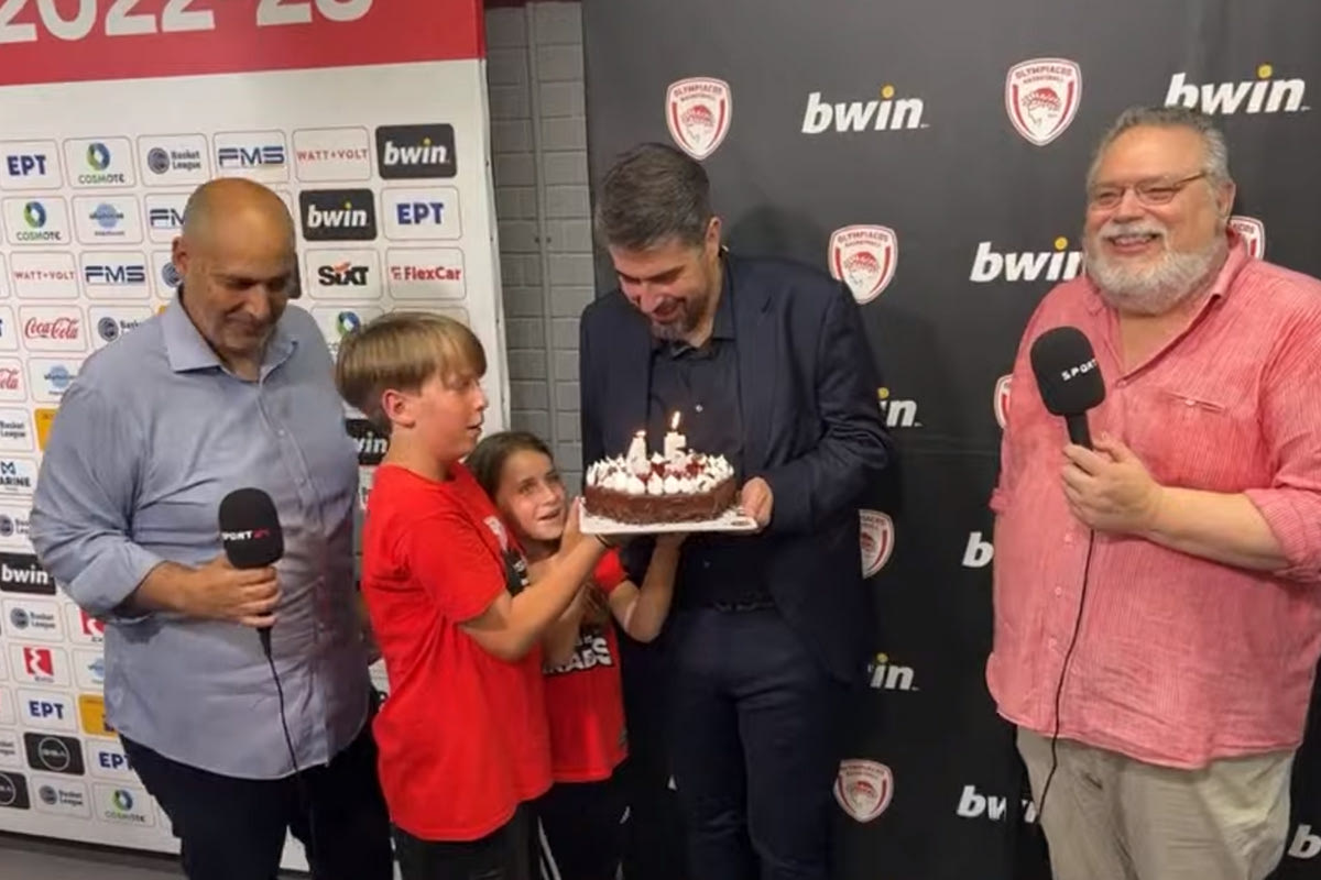 Ο Χρήστος Μπαφές παραχωρούσε δηλώσεις στο SPORT24 για τον νέο Ολυμπιακό και το ΣΕΦ και την ίδια στιγμή μπήκαν στην κάμερα τα παιδιά του με τούρτα έκπληξη για τα γενέθλιά του.