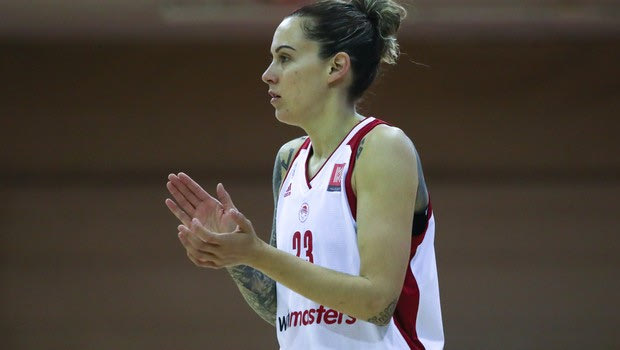 Η Τζάκι Γέμελος με τη φανέλα του Ολυμπιακού σε αγώνα της Α1 Γυναικών