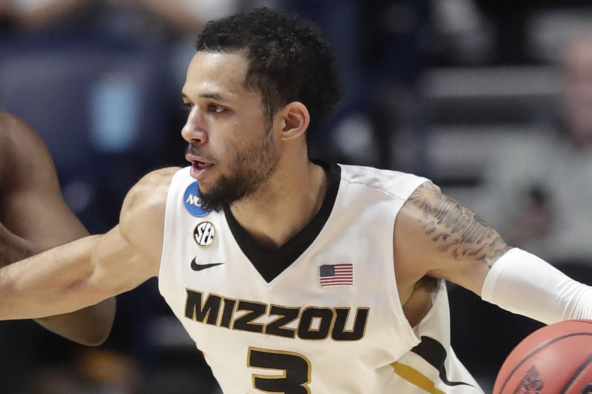 Missouri guard Kassius Robertson (3) drives around Florida State guard Terance Mann (14) in the first half of a first-round game of the NCAA college basketball tournament in Nashville, Tenn., Friday, March 16, 2018. (AP Photo/Mark Humphrey)