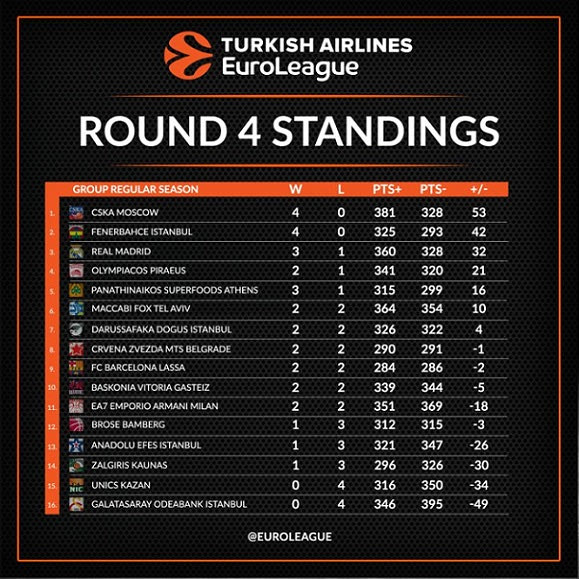 Η τέταρτη αγωνιστική της EuroLeague ολοκληρώθηκε, με τον Ολυμπιακό και τον Παναθηναϊκό να βρίσκονται πολύ ψηλά στη βαθμολογία. Δείτε πως αυτή έχει διαμορφωθεί.