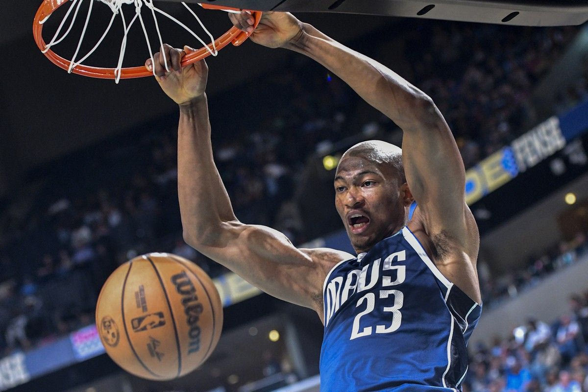 Dallas Mavericks forward Kai Jones (23) dunks in the second half of an NBA basketball game against the Memphis Grizzlies Sunday, April 13, 2025, in Memphis, Tenn. (AP Photo/Brandon Dill)