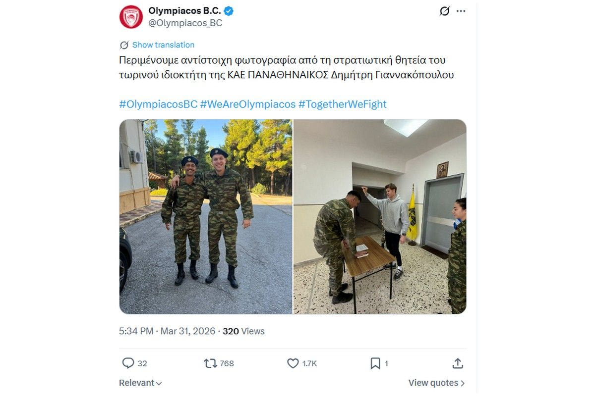 Ο Ολυμπιακός με ανάρτησή του στο Twitter υπογραμμίζει ότι περιμένει αντίστοιχη φώτο στρατιωτικής θητείας με εκείνες των Σάσα Βεζένκοβ, Τάιλερ Ντόρσεϊ και Τόμας Γουόκαπ από τον ιδιοκτήτη της ΚΑΕ Παναθηναϊκός, Δημήτρη Γιαννακόπουλο.