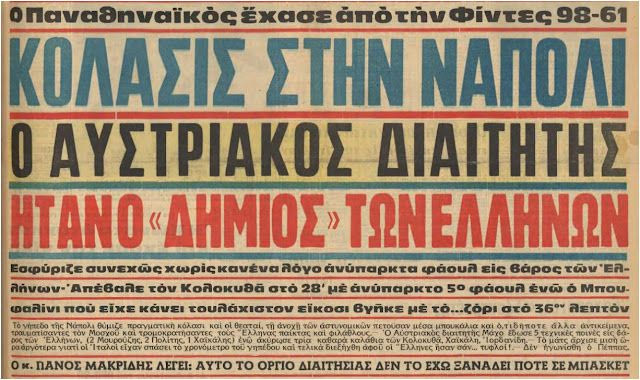 Την άλλη ημέρα… καταβρόχθισα τον Γκεοργκέφσκι που τον είχα και με είχε άχτι, έκανα ένα από τα καλύτερα ματς της καριέρας μου, νικήσαμε τους Γιουγκοσλάβους και ανοίξαμε τον δρόμο προς τον τελικό. Έριξα πολύ ξύλο εκείνο το βράδυ και μάλιστα ο Λάζαρος Λέτσιτς που έφυγε τις προάλλες από τη ζωή είδε κι απόειδε και έβαλε ένα θηρίο, ονόματι Νταμιάνοβιτς για να με μαρκάρει και ο μπαγάσας μού έριξε μια μπουνιά και μάτωσαν τα χείλη μου”!