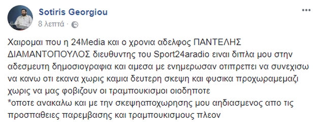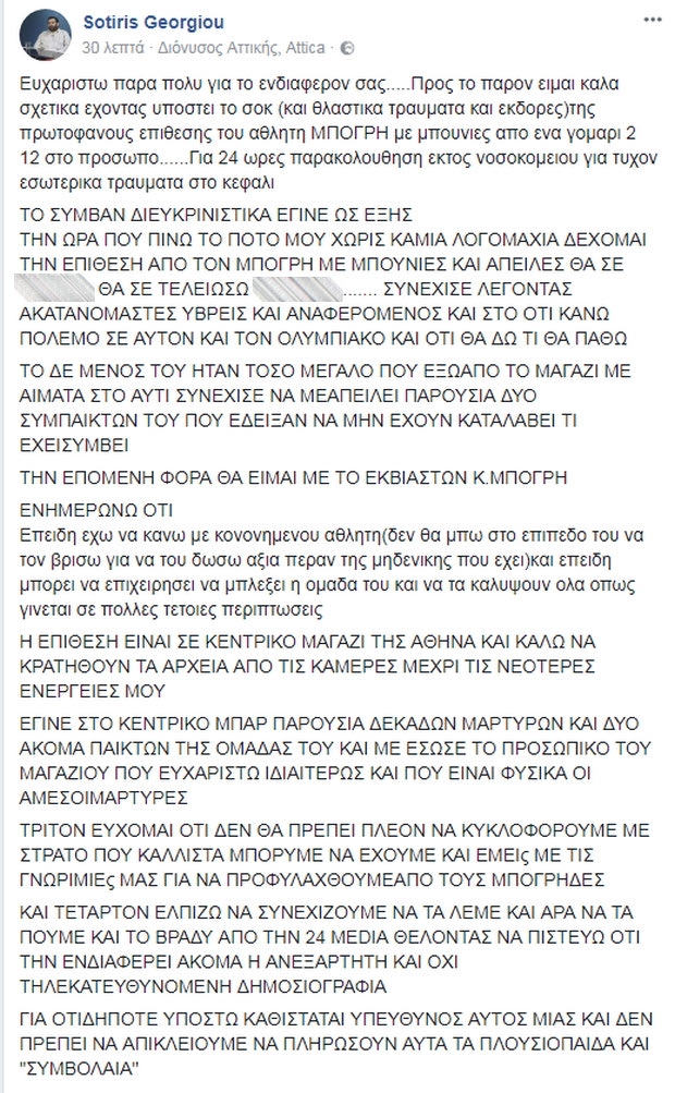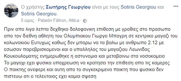 Σύμφωνα με δύο αναρτήσεις του στο Facebook, ο δημοσιογράφος της 24MEDIA (Contra.gr, Sport24 Radio 103.3), Σωτήρης Γεωργίου, δέχθηκε επίθεση με μπουνιές και ύβρεις από τον Γιώργο Μπόγρη, τον παίκτη του Ολυμπιακού.