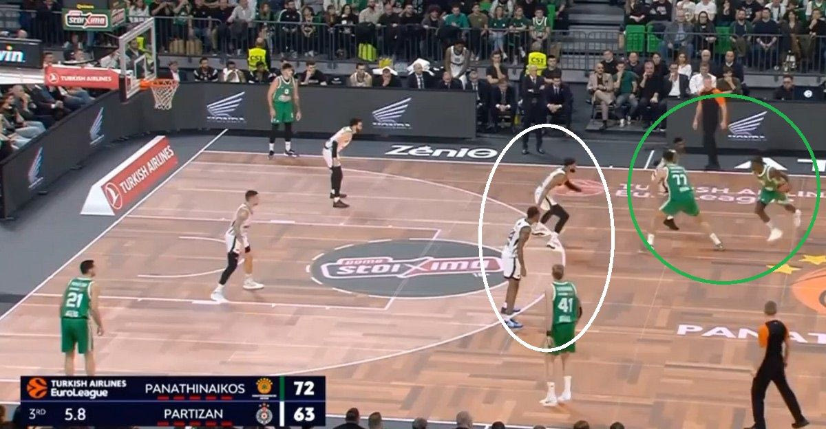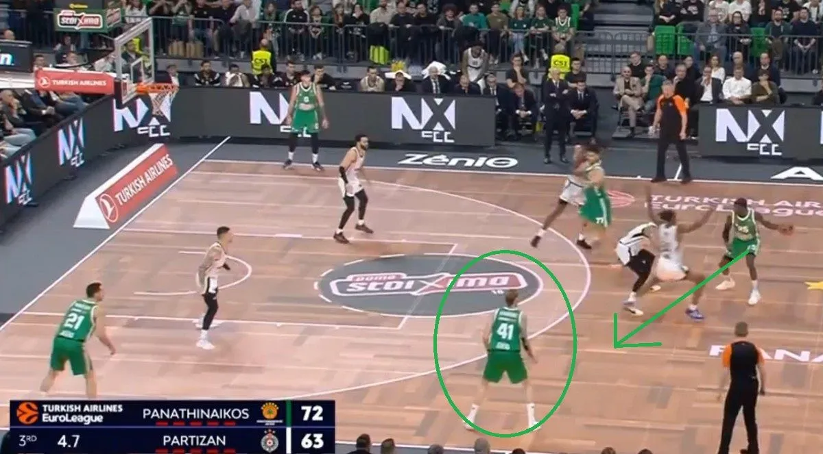 Ο Ναν ετοιμάζεται να παίξει Pick and Roll με τον Γιούρτσεβεν στα 10 μέτρα από το καλάθι. Ο Ντέιβις ετοιμάζεται να βγει δυναμικά, ενώ ο Μάικ είναι έτοιμος να δώσει βοήθεια ως τρίτος παίκτης.