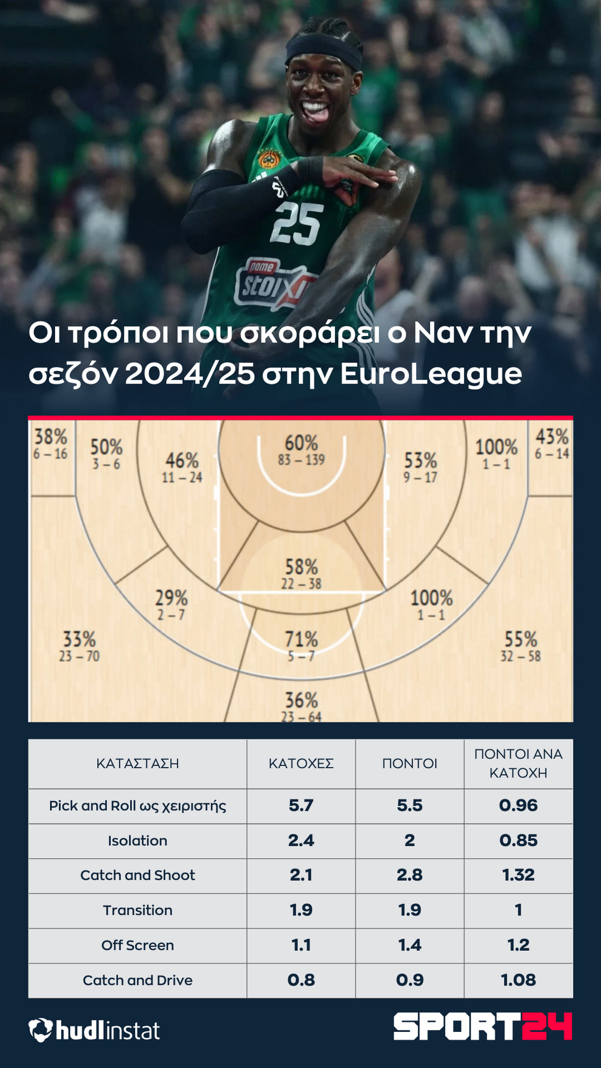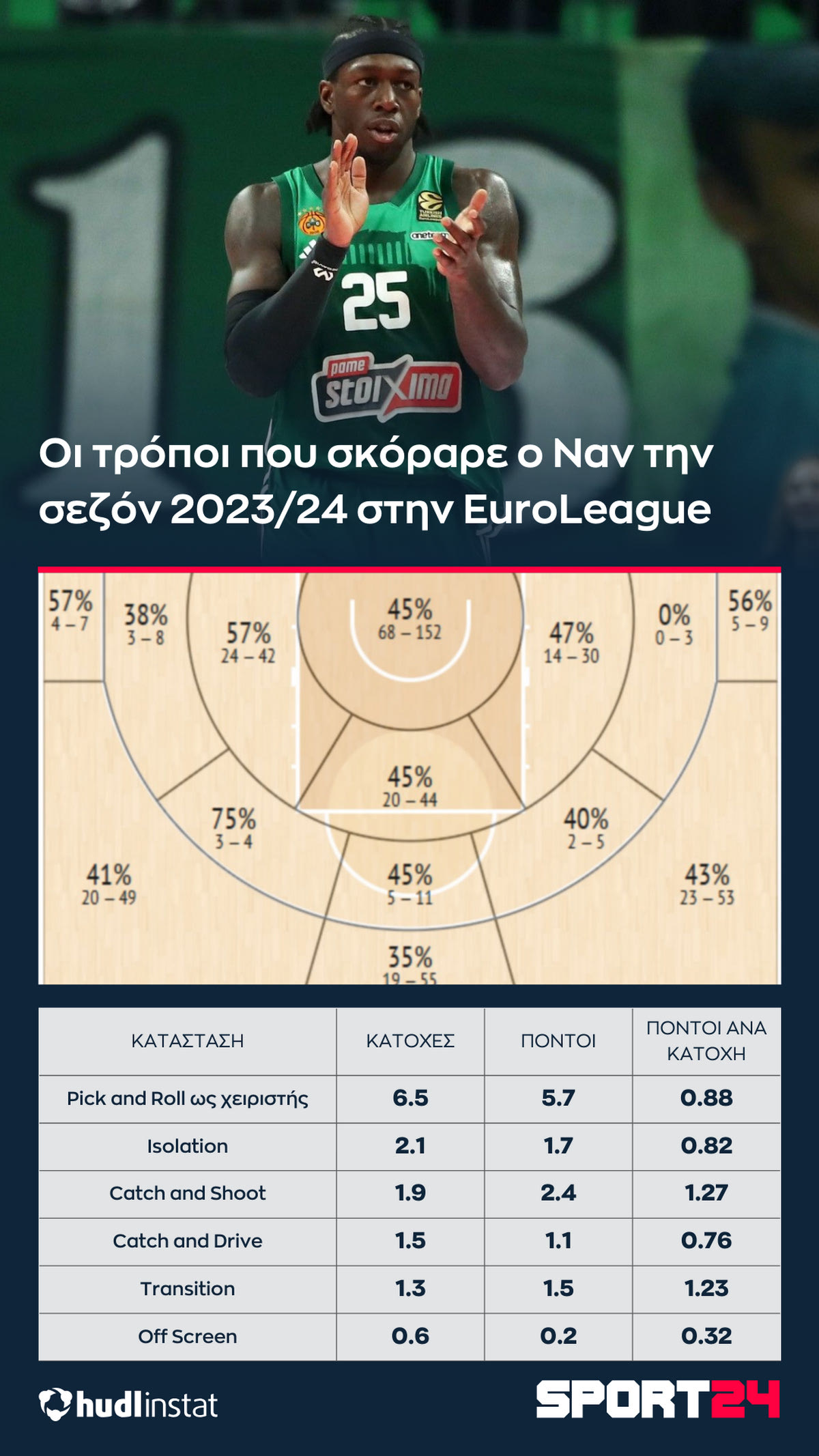 Υπάρχουν πολλά πράγματα που μπορεί να παρατηρήσει κάποιος βλέποντας τα νούμερα του Ναν. Μπορεί να σταθεί στο γεγονός ότι πέρυσι σούταρε με 45% στα σουτ στο “ζωγραφιστό”, που είναι ένα μέτριο νούμερο και φέτος με 60%, που είναι ένα ελίτ νούμερο. Το βασικότερο ωστόσο είναι ότι η σημαντική βελτίωση στο ποσοστό του στα δίποντα έχει εκτοξεύσει την αποδοτικότητά του. Συγκεκριμένα, σύμφωνα με το Hudl Instat, την περσινή σεζόν ο Ναν σημείωνε 0.92 πόντους ανά κατοχή, σε ένα εξαιρετικό νούμερο. Φέτος, όμως, αυτό το νούμερο έχει εκτοξευτεί στους 1.06 πόντους ανά κατοχή, που είναι αδιανόητο για έναν γκαρντ που κουβαλάει μία ολόκληρη επίθεση.