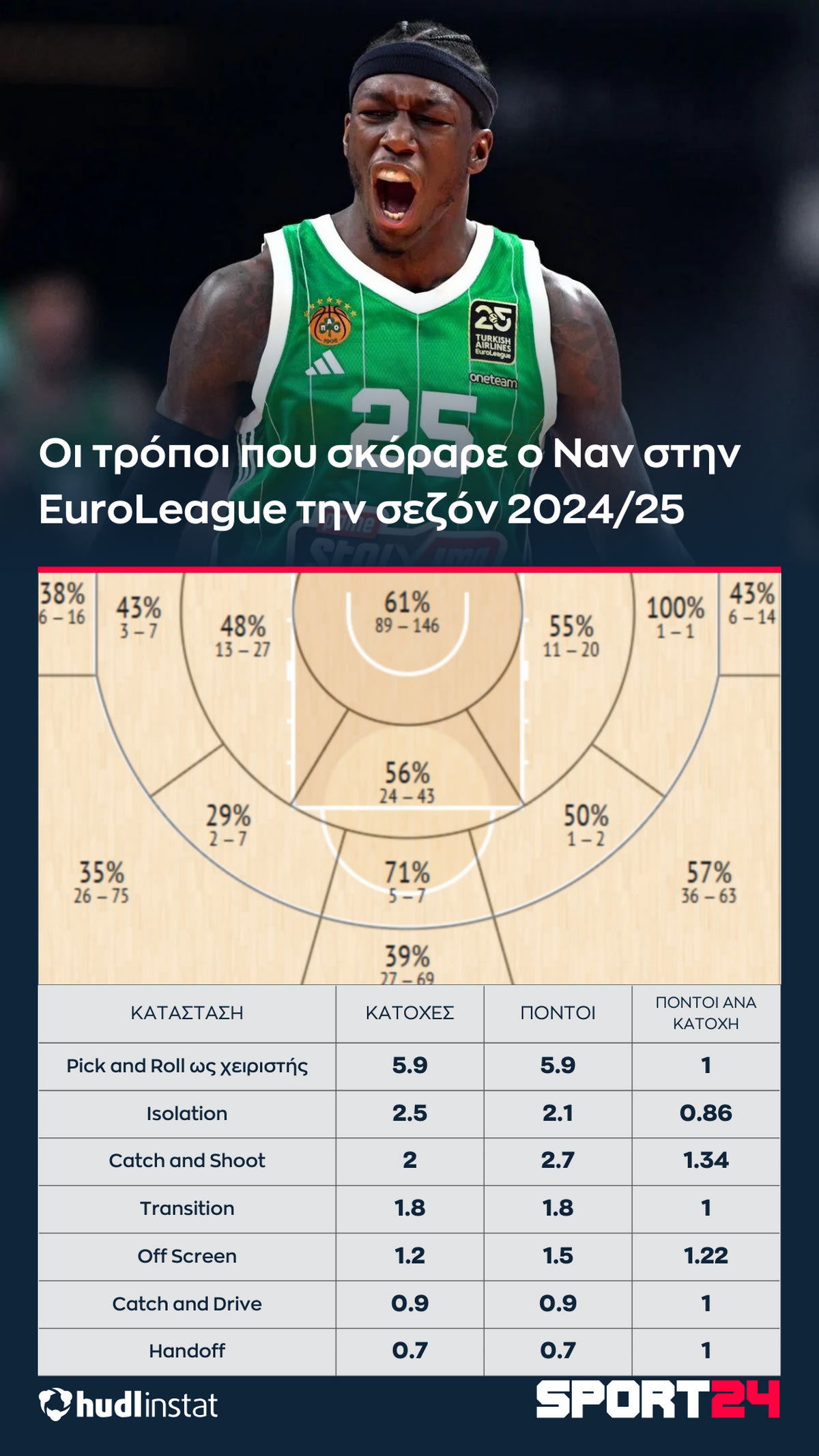 Ο Στέφανος Μακρής αναλύει με τη βοήθεια του Hudl Instat τους τρομερούς αριθμούς του Κέντρικ Ναν την σεζόν 2024/25, όπου αναδείχθηκε MVP της Euroleague.