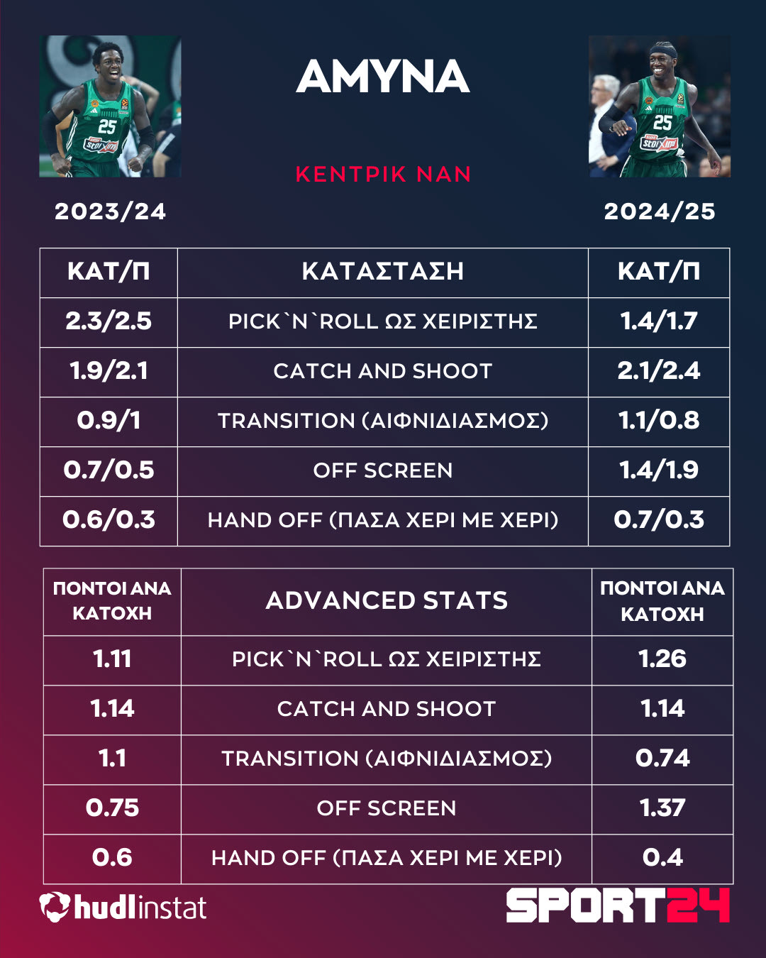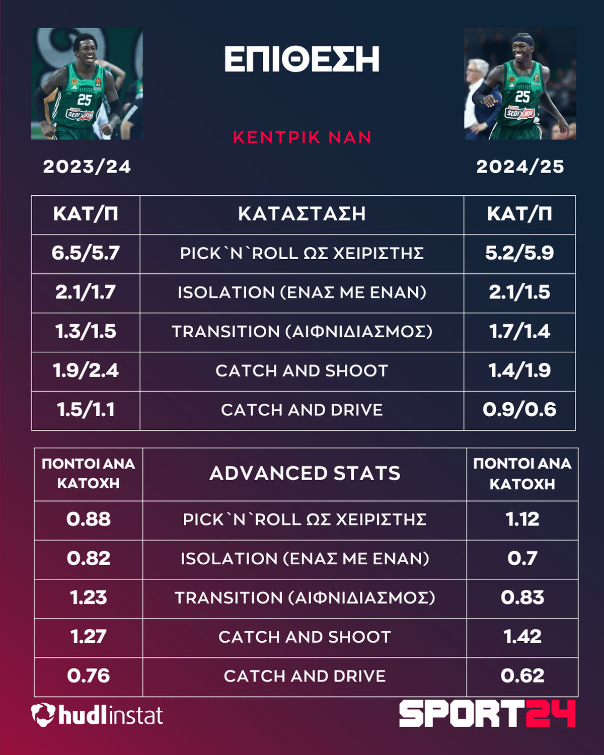 Ο Κέντρικ Ναν είχε μία κακή βραδιά στο Βελιγράδι κόντρα στην Παρτίζαν, συνεχίζοντας να βγάζει έναν εκνευρισμό στις κινήσεις του. Πόσο καλός όμως είναι φέτος και είναι καλύτερος ή χειρότερος από πέρυσι; Ο Στέφανος Μακρής συγκρίνει με την βοήθεια του Hudl Instat τον περσινό με τον φετινό Ναν, δίνοντας απαντήσεις