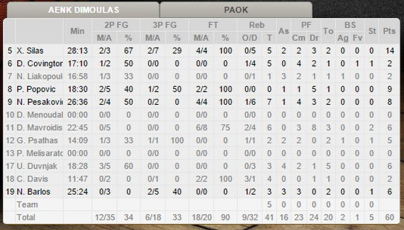 Με καλάθι του Ντούβνιακ έγινε το 47-39, ο Μαυροειδής “έγραψε” το 49-39 (31′) αλλά ο Κάρτερ μείωσε σε 49-42 και σε 49-45 (33′) με δύο σερί τρίποντα. Ο Βον “έφερε” τον ΠΑΟΚ στο -2 (49-47) και μετά ισοφάρισε (49-49 με 0-10 σερί για τον “Δικέφαλο”), για να γίνει μετά το 49-51 (35′) από τον Τσόχλα. Ο τελευταίος “έδωσε” ένα +3 (51-54) στους “ασπρόμαυρους” και ο Μαργαρίτης έκανε το 51-56 στο 36′. Ο Πεσάκοβιτς μείωσε σε 53-56 και ο Σάιλας “έγραψε” το 55-56 στο 38′. Ο τελευταίος ήταν ο “υπεύθυνος” για το 58-56 αλλά ο Τσόχλας “απάντησε” (58-59) και το 60-62 έγινε από τον Κάρτερ στα 53” πριν το τέλος. Στην τελευταία επίθεση του αγώνα ο Σάιλας αστόχησε σε τρίποντο, το ίδιο έγινε μετά και με τον Μπάρλο (άστοχος σε τρίποντο) και έτσι ο ΠΑΟΚ ήταν ο νικητής (60-62).