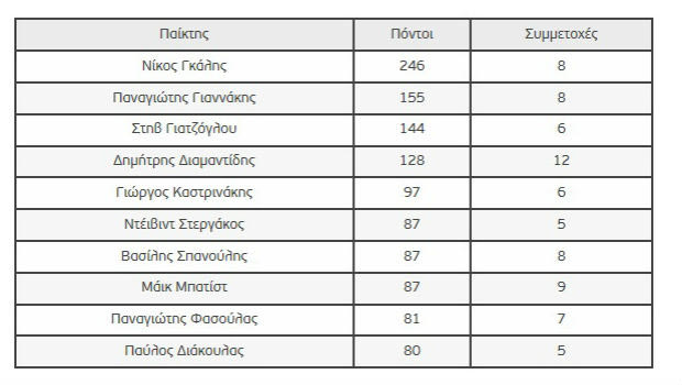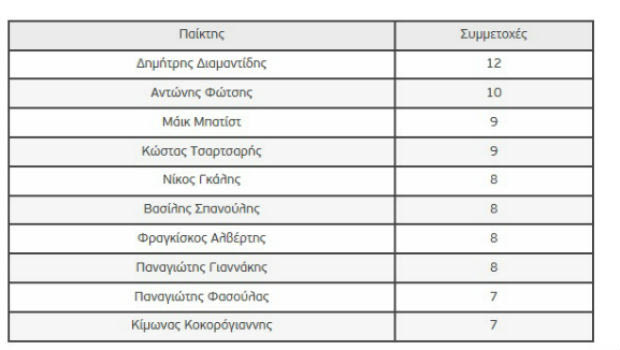 ΟΙ ΠΑΙΚΤΕΣ ΜΕ ΤΙΣ ΠΕΡΙΣΣΟΤΕΡΕΣ ΣΥΜΜΕΤΟΧΕΣ