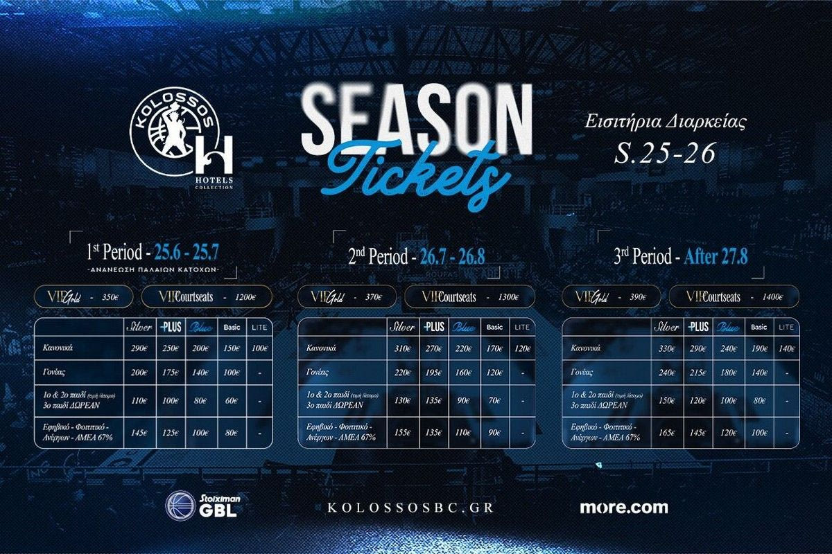 Ο Κολοσσός ανακοίνωσε ότι ξεκίνησε η διάθεση των εισιτηρίων διαρκείας για την σεζόν 2025/26, η οποία θα πραγματοποιηθεί σε τρεις περιόδους.
