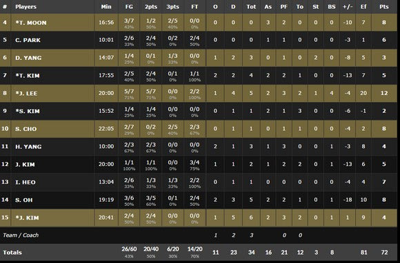 Κορέα (Γου): Μουν (Τζαρόντ Στίβενσον) 8, Παρκ 6, Ντ. Γιανγκ 3, Τ. Κιμ 5, Λι 12, Σ. Κιμ 2, Τσο 8, Χ. Γιάνγκ 4, Τζ. Κιμ 5, Χέο 7, Οχ 8, Τζέι Κιμ 4.