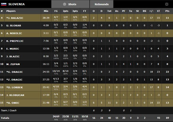 Σλοβενία (Ζντοβτς): Μπάλαζιτς 11 (6 ριμπ.), Σλόκαρ 1, Νίκολιτς, Πρέπελιτς, Μούριτς 3, Μπλαζιτς 4, Ζούπαν 8, Γκ. Ντράγκιτς 22, Ζ. Ντράγκιτς 13, Λόρμπεκ 14, Κλόμπουτσαρ, Όμιτς 13 (11 ριμπ.).