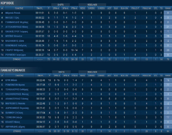 Κόροιβος (Μαρκόπουλος): Μάρσαλ 5, Ματζέτ 6 (1), Γιαννακίδης, Αγγελόπουλος 13 (3), Παπαπέτρου, Ντέιβις 18 (2), Βασίλιεβιτς 7 (1), Κανονίδης, Γκάρετ 14, Ρούμπιο 10.