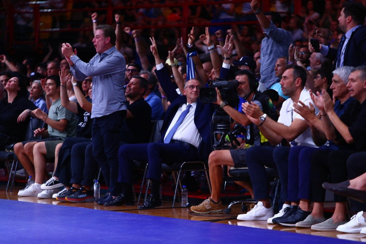 Ρικ Πιτίνο και Βαγγέλης Λιόλιος πανηγύρισαν με την ψυχή τους τρίποντο που σκόραρε η Εθνική Ομάδα απέναντι στην Κροατία στο πρώτο μέρος του τελικού του Προολυμπιακού του ΣΕΦ.