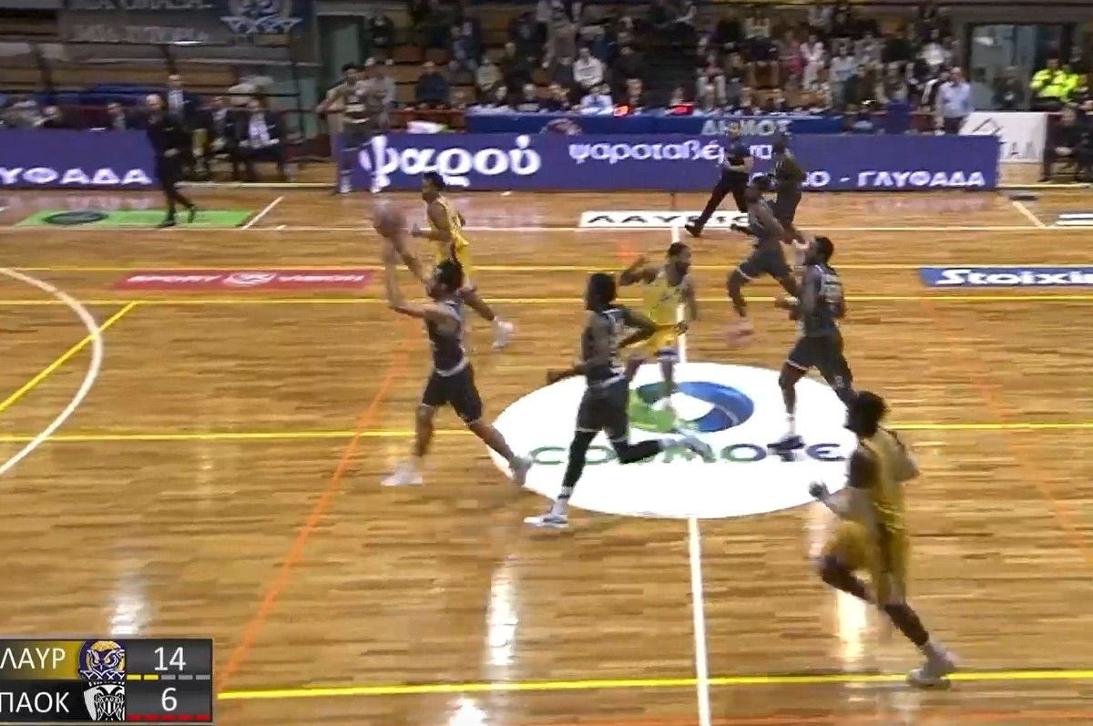 Ο Δημήτρης Κατσίβελης πέτυχε καλάθι από το κέντρο στην αναμέτρηση του Λαύριο με τον ΠΑΟΚ, ωστόσο αυτό δεν μέτρησε λόγω του φάουλ του Ταζ Σέρμαν.
