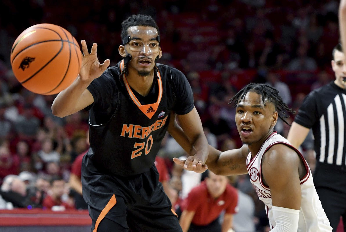 Arkansas guard JD Notae (1) puts pressure on Mercer guard Jalen Johnson (20) during the second half of an NCAA college basketball game Tuesday Nov. 9, 2021, in Fayetteville, Ark. (AP Photo/Michael Woods) 2021 AP Photo/Michael Woods