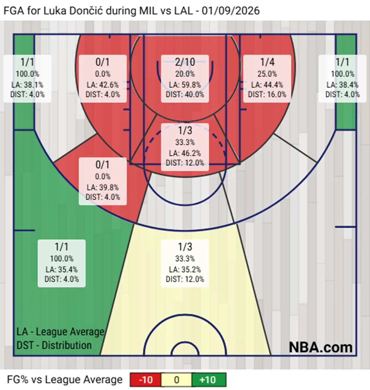 Στο 23-13 έπεσαν οι Λέικερς (10-7 εντός και 13-6 εκτός έδρας), που είδαν τον Λούκα Ντόντσιτς να κλείνει τον αγώνα με 4/19 δίποντα (!) και να αποχωρεί με έξι φάουλ πριν από την τελευταία κατοχή της ομάδας του. Για ένα ριμπάουντ έχασε το triple-double ο ΛεΜπρόν Τζέιμς (26 πόντοι, 9 ριμπάουντ, 10 ασίστ).