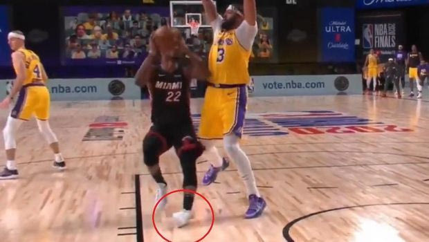 Ο Τζίμι Μπάτλερ στάθηκε άτυχος στο φινάλε του πρώτου ημιχρόνου του Game 1 των τελικών των Λέικερς με τους Χιτ, αφού σε μία προσπάθειά του "γύρισε" άσχημα τον αριστερό του αστράγαλο.