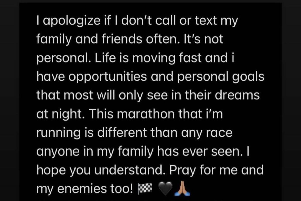 Ζητώ συγνώμη αν δεν τηλεφωνώ ή δεν στέλνω πολύ συχνά στους φίλους και τους συγγενείς μου. Δεν είναι προσωπικό. Η ζωή κινείται γρήγορα και έχω ευκαιρίες και προσωπικούς στόχους, που οι περισσότεροι θα δουν μόνο στα όνειρα τους τα βράδια. Ο αγώνας αυτός που τρέχω είναι διαφορετικός από κάθε άλλο είδους αγώνα, που ο οποιοσδήποτε στην οικογένεια μου έχει δει. Ελπίζω να καταλαβαίνετε. Προσευχηθείτε για εμένα και τους εχθρούς μου”, έγραφε χαρακτηριστικά το post που ανέβασε story.