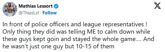 Ο σέντερ του τριφυλλιού λίγη ώρα μετά, έκανε μία ανάρτηση στο X γράφοντας: “Μπροστά σε αστυνομικούς και εκπροσώπους της λίγκας! Το μόνο που έκαναν ήταν να μου πουν να ηρεμήσω, ενώ αυτοί οι τύποι συνέχιζαν και έμειναν σε όλο το παιχνίδι… Και δεν ήταν μόνο ένας, αλλά 10-15 από αυτούς“.