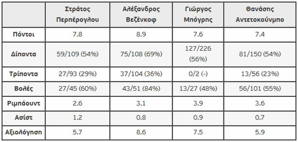Κάπως έτσι, ο Στράτος Περπέρογλου, ο Αλέξανδρος Βεζένκοφ, ο Γιώργος Μπόγρης και ο Θανάσης Αντετοκούνμπο ολοκλήρωσαν την παρουσία τους στη Liga Endesa, όντες έτοιμοι να σχεδιάσουν το μέλλον τους. Ο πρώτος άλλωστε έχει ήδη συνδεθεί με τον Παναθηναϊκό Superfoods . Η φετινή ρονιά έχει πάντως θετικό (προσωπικό) πρόσημο για τους άλλους τρεις, που βελτίωσαν σημαντικά τους αριθμούς τους και έδειξαν ικανοί να σταθούν και να ανταποκριθούν στις απαιτήσεις του καλύτερου πρωταθλήματος της Ευρώπης.