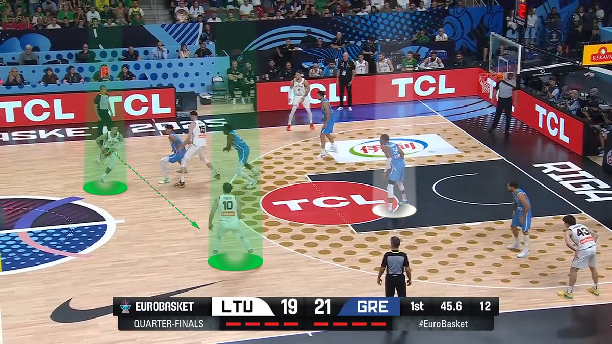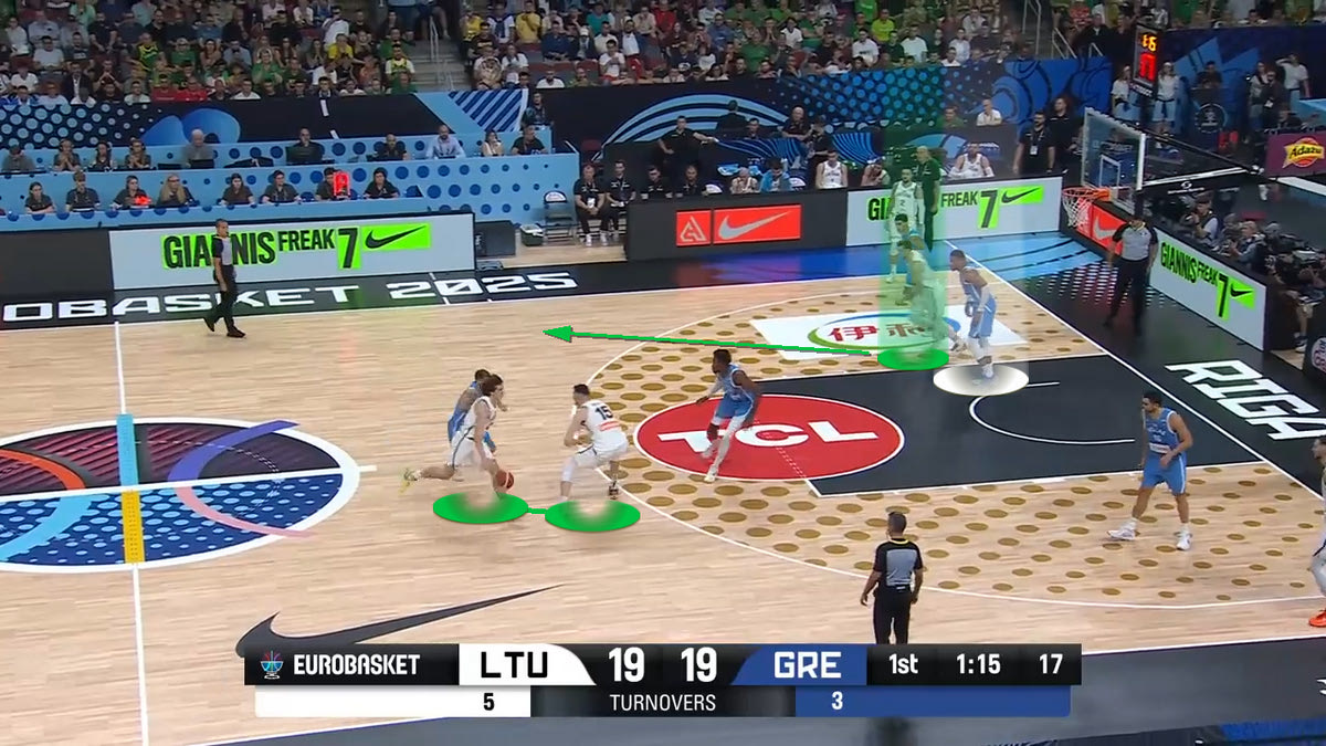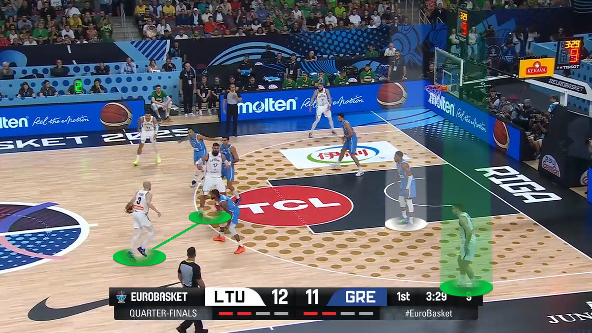 Ο Γιάννης αγνοούσε επιδεικτικά τους δύο φόργουορντ και βρισκόταν συνεχώς στην ρακέτα, θέλοντας να κλείσει το Pick and Roll των Λιθουανών. Αυτό, αρχικά, έδινε την πολυτέλεια στους γκαρντ της Ελλάδας να είναι πιο πιεστικοί στην μπάλα. Ιδού ένα παράδειγμα: