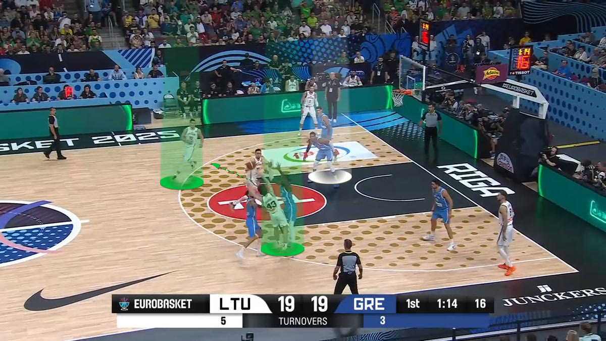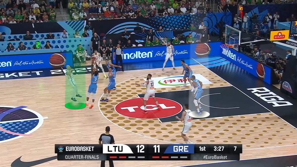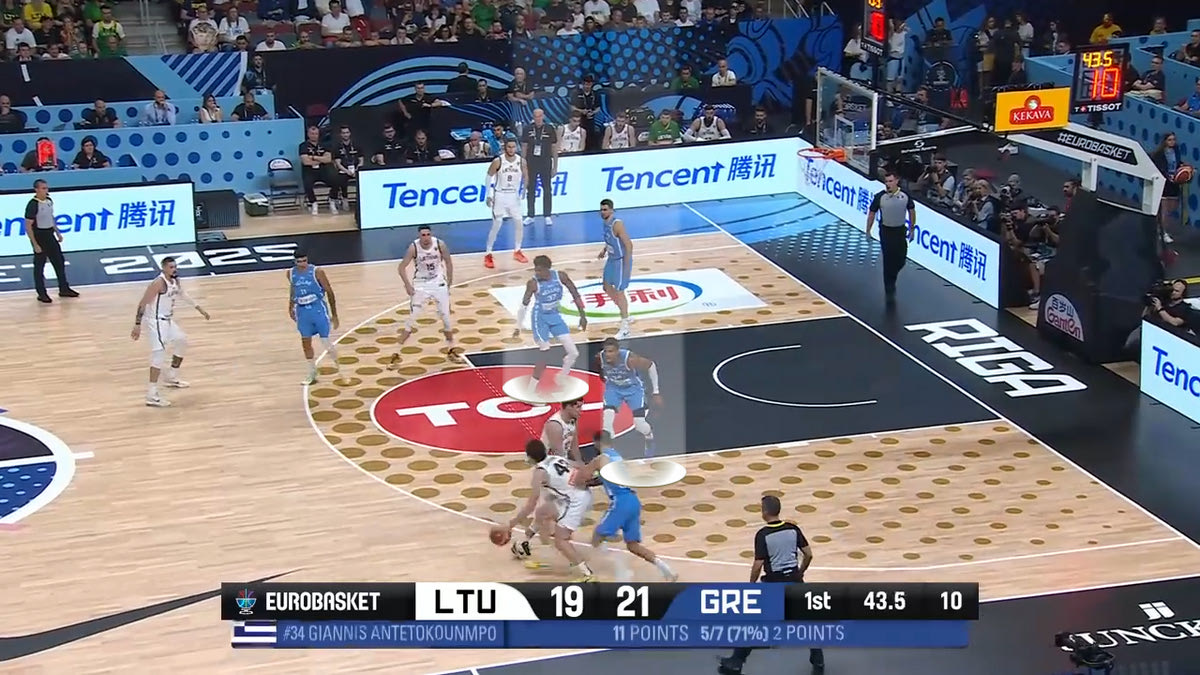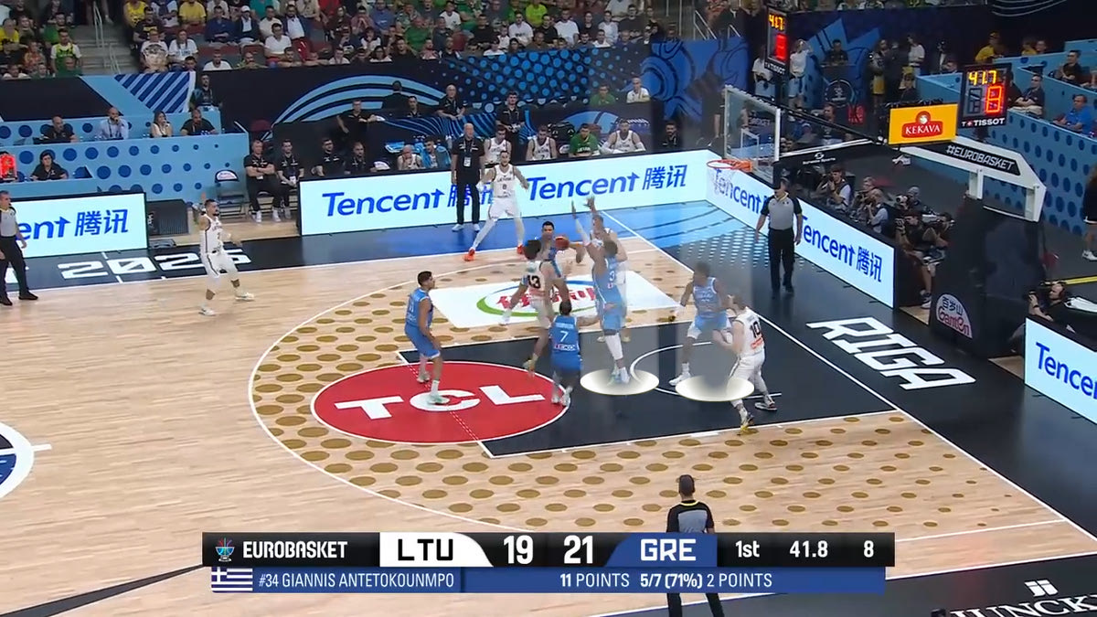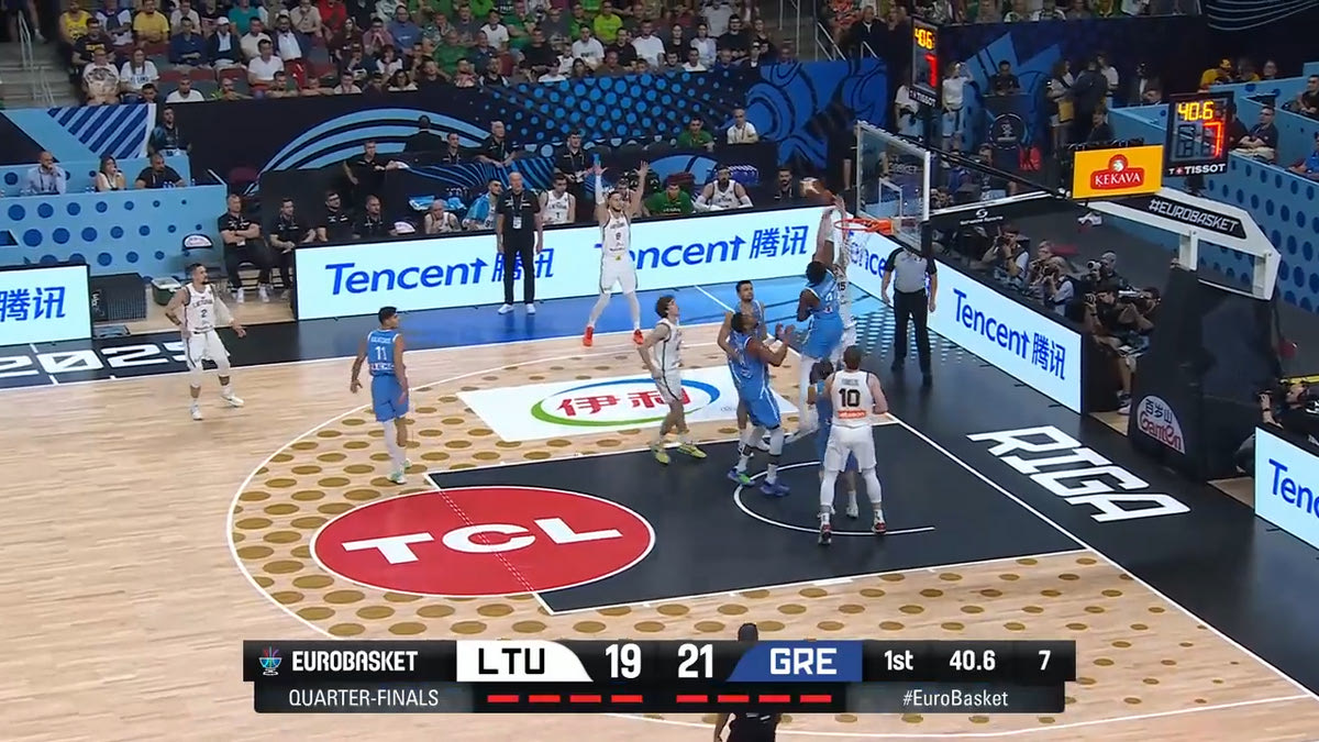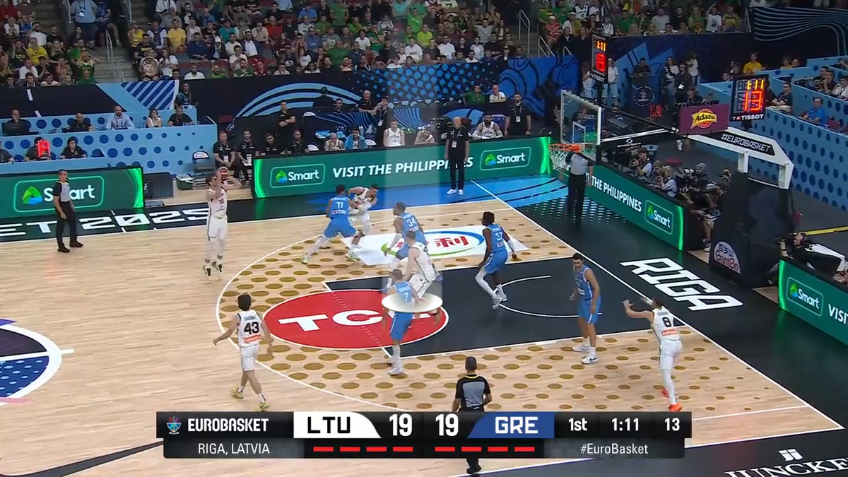 Ο Σαρτζιούνας πάει προς το καλάθι και ο Γιάννης σηκώνεται να τον κόψει. Η Ελλάδα έχει 4 παίκτες στην ρακέτα. Ο Κώστα καλύπτει τον Τουμπέλις. Ο Σαρτζιούνας πασάρει στον Μπιρούτις.