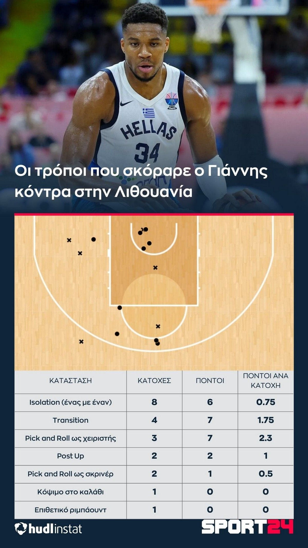Ο Γιάννης ήξερε ότι κόντρα στα μεγάλα κορμιά των Λιθουανών και τα συνεχή double team δεν θα μπορούσε να πραγματοποιήσει μία εμφάνιση αντίστοιχη με αυτή κόντρα στο Ισραήλ μερικές ημέρες νωρίτερα. Για αυτό επιτέθηκε από έξω προς τα μέσα – παίζοντας με πρόσωπο – και όχι ποστάροντας. Ήθελε να βλέπει όλο το γήπεδο πριν πάρει απόφαση. Μοίρασε το παιχνίδι. Απλώς δεν μπήκαν τα σουτ να κάνουν πιο εύκολο το έργο του. Ενώ όμως δεν μπήκαν τα σουτ από στάση (Catch and Shoot), το παιχνίδι της Ελλάδας άνοιξε αλλιώς: Με σουτ μετά από ντρίμπλα.