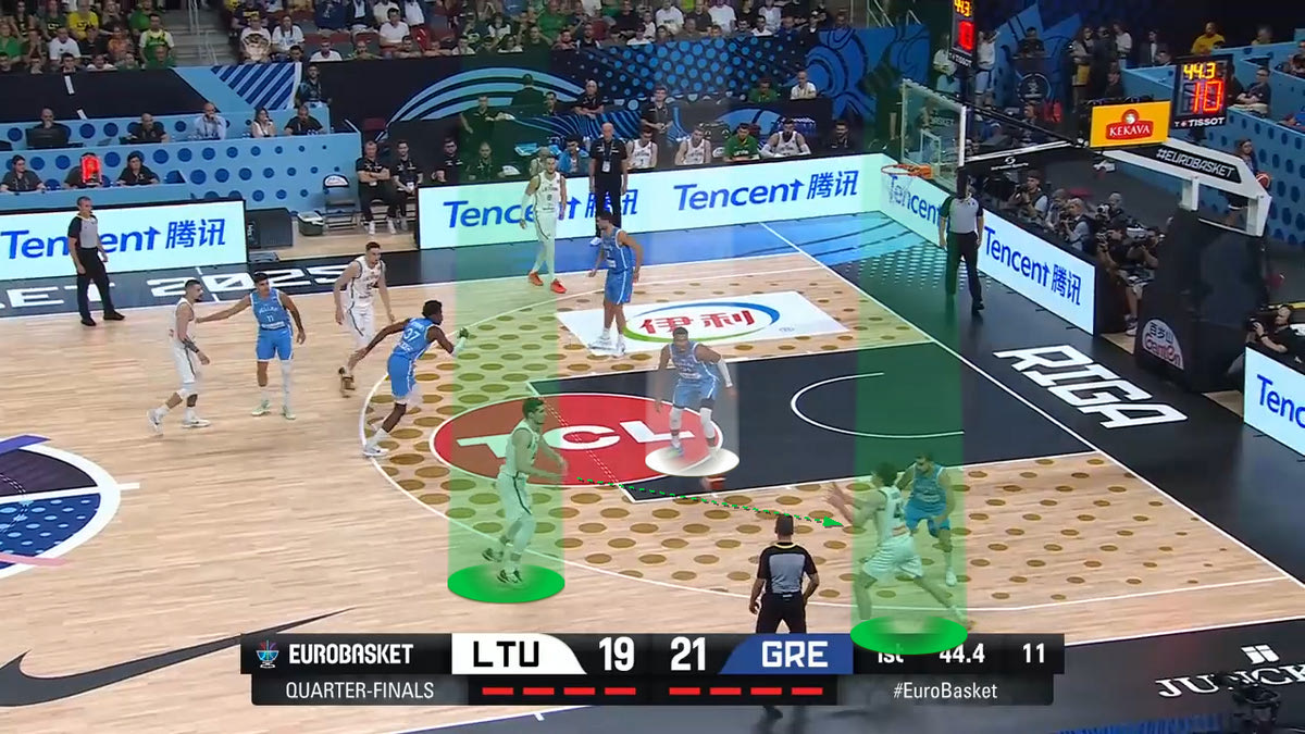 Ο Σαρτζιούνας παίρνει σκριν από τον Μπιρούτις. Ο Τουμπέλις ανεβαίνει στο τρίποντο. Ο Γιάννης δεν τον ακολουθεί και μένει πίσω.