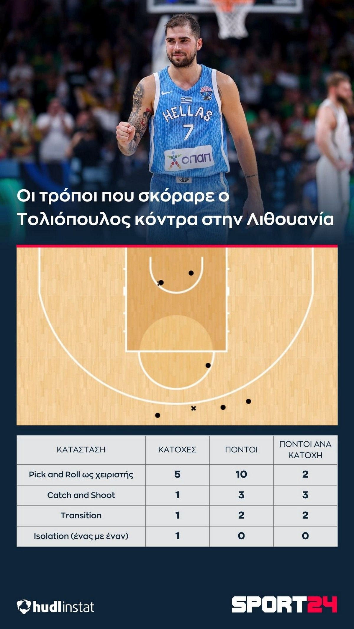 Η Λιθουανία είναι μία ομάδα που έχει επιλέξει στο Pick and Roll να δίνει το σουτ στον αντίπαλο χειριστή, ώστε να αφήνει τον Βαλαντσιούνας κοντά στο καλάθι. Ήταν κομβικό για τους γκαρντ της Ελλάδας να βάλουν αυτά τα σουτ. Και τα έβαλαν. Σύμφωνα με το Hudl Instat, η Ελλάδα πήρε 16 σουτ σε κατάσταση Pick and Roll με σουτ του χειριστή (ρεκόρ για φέτος) και σημείωσε 23 πόντους (1.44 ανά κατοχή), σε ένα εκπληκτικό νούμερο.