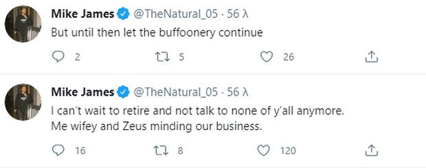 Για αρκετές ώρες μετά το πρώτο τιτίβισμα της “αρκούδας” ο Μάικ Τζέιμς απαντούσε σε σειρά από tweets, για να φτάσει -σε κάποιο σημείο- να πει πως “ανυπομονώ να αποσυρθώ και να μην μιλάω με κανέναν σας. Εγώ, η σύζυγός μου και ο Δίας (σ.σ. έτσι λέγεται ο σκύλος του) να κοιτάμε τη δουλειά μας. Αλλά μέχρι τότε, συνεχίστε τις βλακείες σας“.